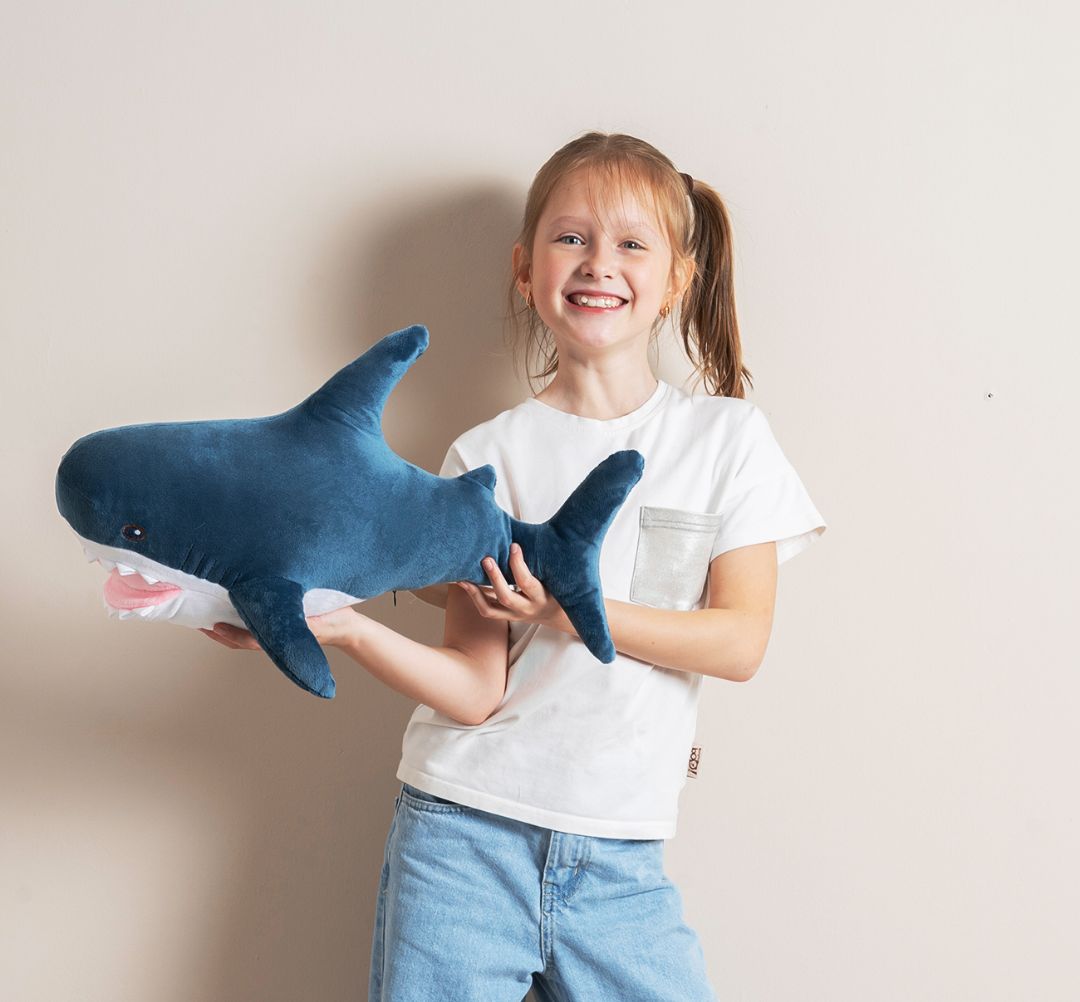Плюшевая акула от собственного производства фабрики. Более 2 лет работаем как производство полного цикла: разрабатываем дизайн, шьем игрушки и упаковываем для доставки и продажи.